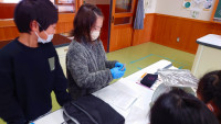 今日は、三色じゃこどんぶりです。炒り卵、ちりめんじゃこ、ほうれん草のおひたしを、ごはんの上にきれいに盛りつけました。いろどりがとてもきれいでした。ちりめんは、明浜町のちりめんです。ごはんと混ぜて食べるのも、それぞれの味を楽しみむもいいですね。こぼさないように上手におはしを使って食べました。